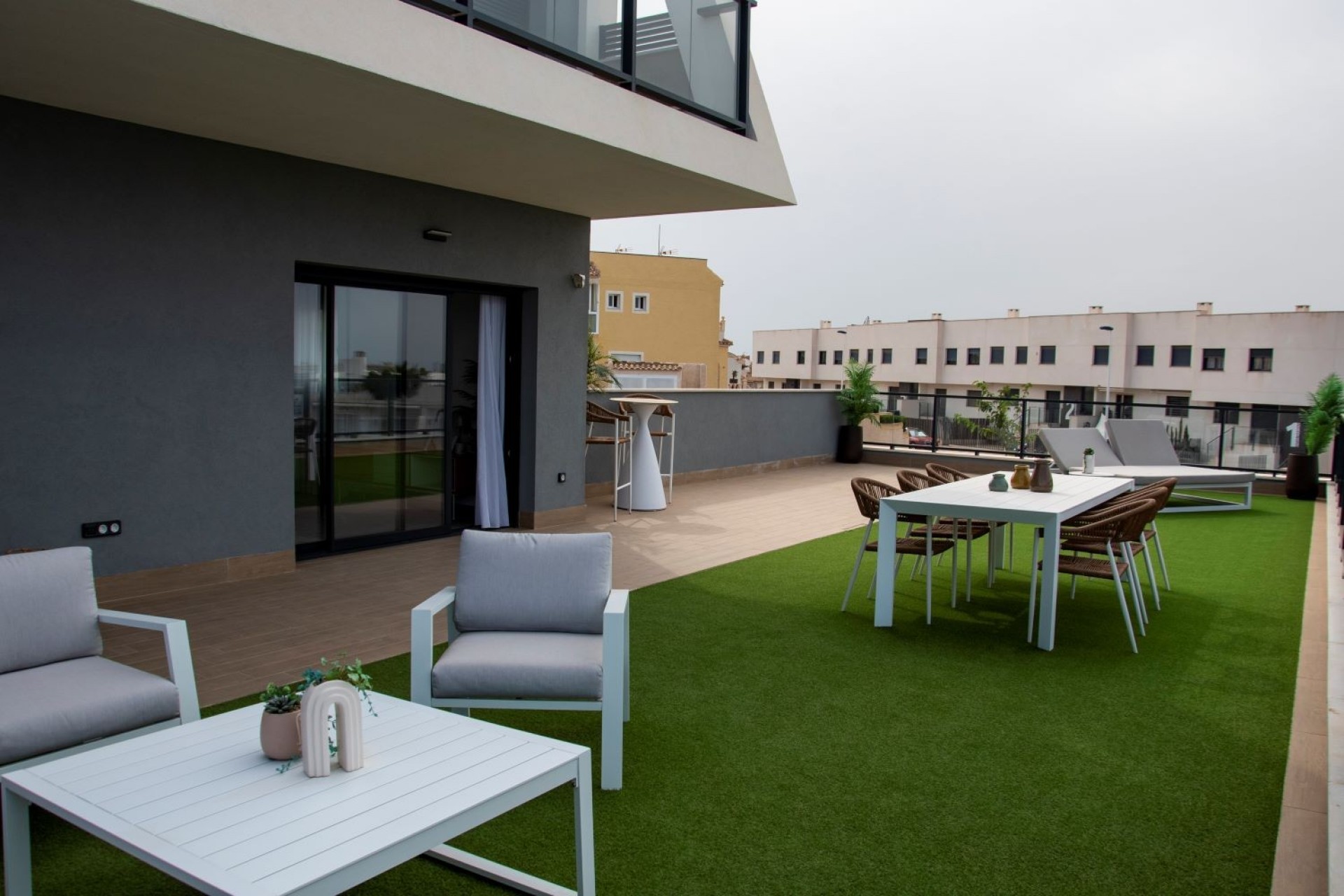 Esta nueva y moderna urbanización se encuentra a pocos minutos andando de la hermosa playa de Carabassi en Gran Alacant. Todos los pisos son de excelente calidad. El complejo cuenta con una piscina central, hermosos jardines, una zona de juegos para niños y un sendero de bioentrenamiento para todas las edades. Esta vivienda se encuentra en planta baja y cuentan con tres bonitos dormitorios y dos baños. Concepto de cocina abierta, está conectada con el amplio salón que conduce a la gran terraza y a su propio jardín privado. Estos apartamentos tienen vistas al jardín comunitario y cada uno tiene su propia plaza de aparcamiento subterráneo con trastero. Este complejo está situado a 10 minutos en coche del centro de Alicante y a 5 minutos del aeropuerto. Para más información, póngase en contacto con nosotros. Precios sujetos a disponibilidad.