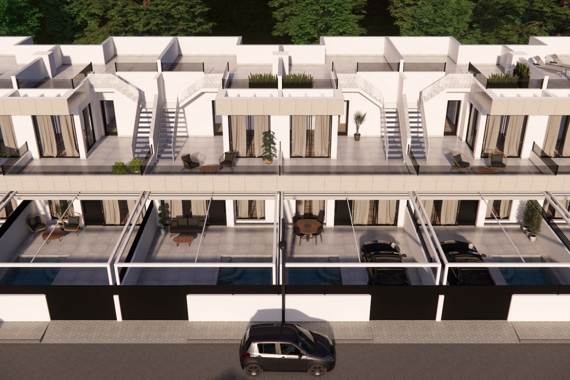 These homes are built over two floors and feature 3 bedrooms, 2 bathrooms, and a separate toilet. On the ground floor, you'll find a spacious living room with an open kitchen and a bedroom with an en-suite bathroom. The first floor offers 2 more bedrooms and a shared bathroom, both connected to a terrace. In the garden, you can enjoy your private swimming pool, and there is a private parking space for your car. Additionally, all homes come with built-in wardrobes, electric shutters, a fully finished kitchen with all appliances, an electric gate, and fully equipped bathrooms with underfloor heating. Rojales, a charming village in Alicante, Spain, offers an authentic Spanish atmosphere and a rich cultural heritage. Located near the Mediterranean Sea and the Costa Blanca, it boasts golf courses such as La Marquesa Golf, various restaurants, shops, and medical facilities. Nature lovers can explore nature parks and walking trails along the Segura River. With a perfect blend of rustic charm and modern amenities, Rojales is ideal for both permanent residents and holidaymakers. Prices are subject to availability. Contact us for more information.