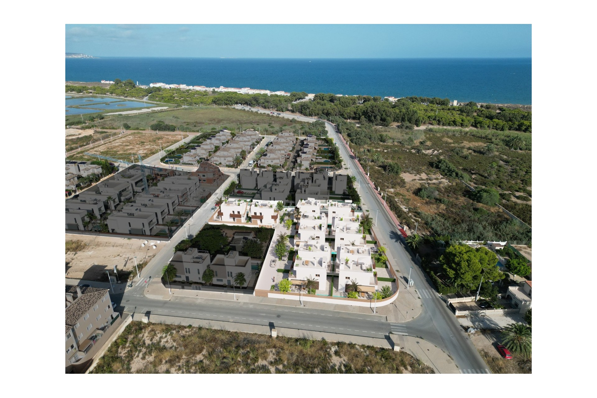 Next to the Mediterranean Sea, surrounded by a privileged environment: the natural setting of Las Salinas, of extreme beauty for lovers of nature and comprising a strip of dunes with a hundred-year-old pine forest and golden sandy beaches with clean, crystalline waters, making it an exclusive place to live or spend the summer all year round, and within easy reach of all services. We have designed a set of 12 independent villas in a modern Mediterranean style, with private plots of different sizes, 3-bedroom homes with 3 bathrooms, kitchen open to the living room and private swimming pool. The rooms are comfortable and cosy, with selected materials to create an ideal and unique atmosphere. Prices subject to availability. Please contact us for more information.