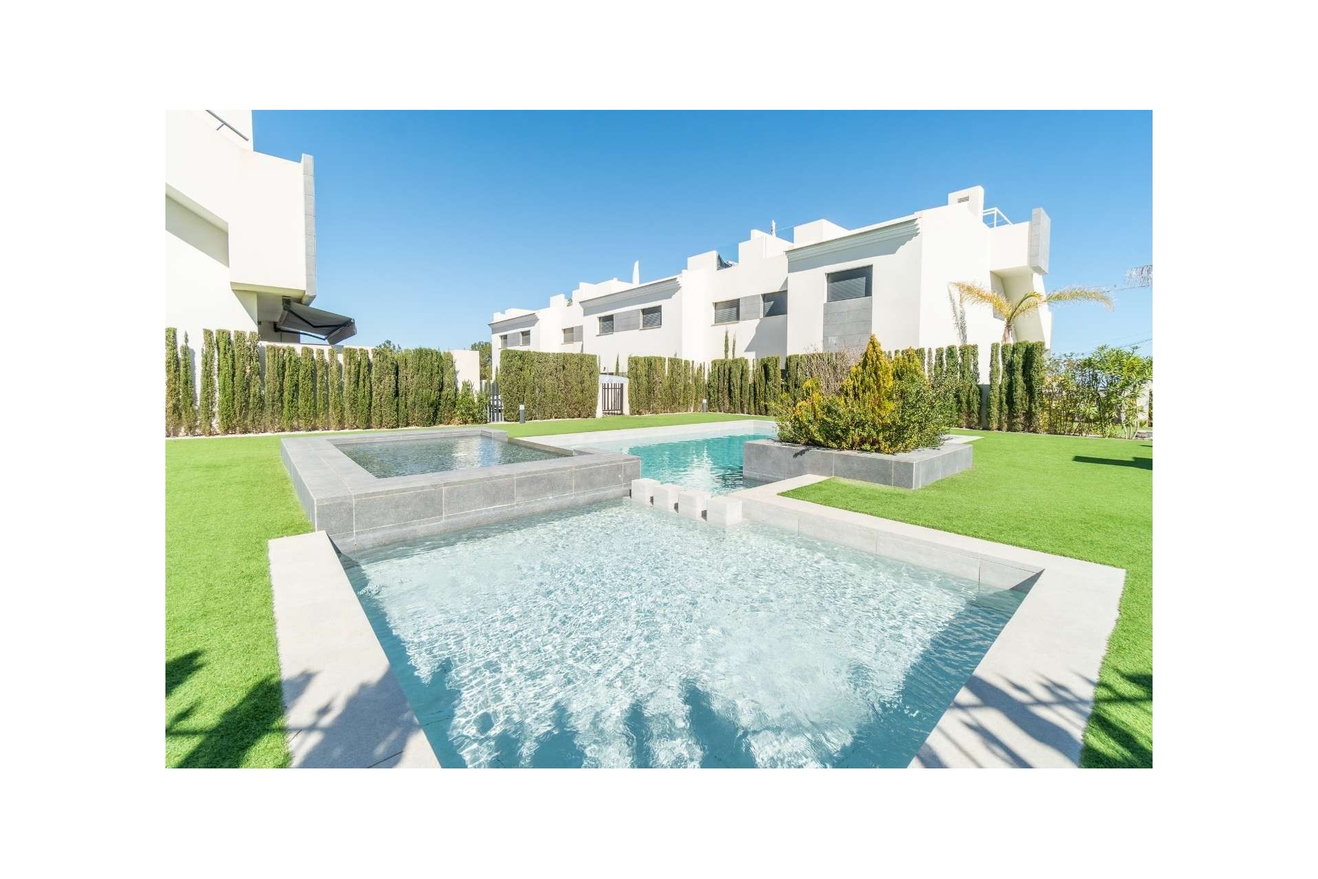 Enjoying the Mediterranean lifestyle begins in a place where comfort, nature and quality come together. This exclusive residential complex is located in Los Balcones, one of the most attractive and peaceful areas of Torrevieja on the Costa Blanca. The surroundings are characterised by open views and the protected natural beauty of the Pink Lagoon, while the beaches of Torrevieja and Orihuela Costa are just a short distance away. The modern apartments feature three spacious bedrooms and are finished with high-quality materials and a contemporary design. Large windows provide plenty of natural light and create a pleasant living space. Each property has a private outdoor area in the form of a solarium and/or terrace, ideal for fully enjoying the sunny climate and the surroundings. The complex offers attractive communal facilities, including landscaped gardens, communal swimming pools with relaxation area and a heated jacuzzi, making it perfect for both relaxation and permanent living. You can choose between a ground-floor property with terrace or an apartment on the upper floor with terrace and private solarium. An ideal combination of tranquillity, luxury and an excellent location on the Costa Blanca. Prices subject to availability. Please contact us for more information.