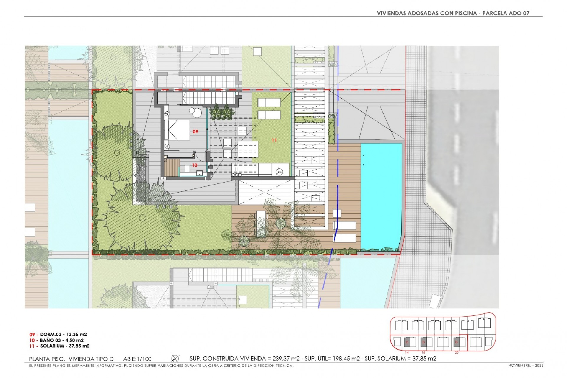 Estas viviendas adosadas de 3 dormitorios constan en la planta baja de: una cocina americana con un luminoso salón/comedor todo diáfano con grandes ventanales que se abren completamente a la terraza y al jardín, además de 2 dormitorios y 2 baños. En la planta superior se encuentra el 3er dormitorio, otro baño y un solarium. Debajo hay un sótano muy grande. Cada vivienda tiene su propia plaza de aparcamiento en el exterior y una piscina privada. Estas villas están construidas con materiales de alta calidad y disponen de aire acondicionado frío-calor por conductos, calefacción por suelo radiante y agua caliente por aerotermia. Se venden con cocinas totalmente equipadas (electrodomésticos incluidos) y baños.