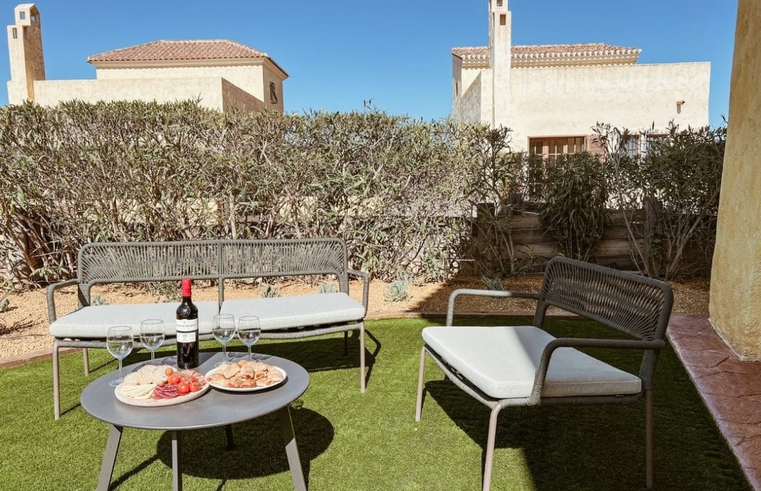 Ta wspaniała willa z czterema sypialniami znajduje się w spokojnych wewnętrznych ogrodach prestiżowej społeczności Desert Gold, oferując zapierające dech w piersiach widoki na mistrzowskie pole golfowe Indiana oraz majestatyczne góry w tle. Willa została zaprojektowana w tradycyjnym stylu „casas del campo” z doliny Almanzora, doskonale łącząc autentyczny urok z nowoczesnymi udogodnieniami. Dzięki dużym tarasom i pergolom nieruchomość zapewnia mnóstwo przestrzeni na świeżym powietrzu do relaksu i rozrywki. Wewnątrz znajdują się terakotowe podłogi i żywe hiszpańskie kafelki, które podkreślają śródziemnomorski charakter willi. Główna sypialnia, położona na pierwszym piętrze, wychodzi na przestronny taras, idealny do podziwiania widoków. Dodatkowe atuty to 3 łazienki (w tym 2 en-suite), przestronna część dzienna i jadalna na otwartym planie, prowadząca na skąpany w słońcu taras, prywatne solarium na dachu oraz prywatny ogród. Mieszkańcy mogą również korzystać ze wspólnego basenu, pięknie zagospodarowanych ogrodów oraz wygodnego miejsca parkingowego w garażu podziemnym. Położona w bezpiecznej, zamkniętej społeczności, nieruchomość oferuje przestronną powierzchnię mieszkalną wynoszącą 135 m² oraz tarasy o powierzchni 62 m². Ta willa to idealny dom lub wakacyjna przystań dla miłośników golfa i osób poszukujących spokojnego, luksusowego stylu życia. Ceny zależą od dostępności. Skontaktuj się z nami, aby uzyskać więcej informacji.