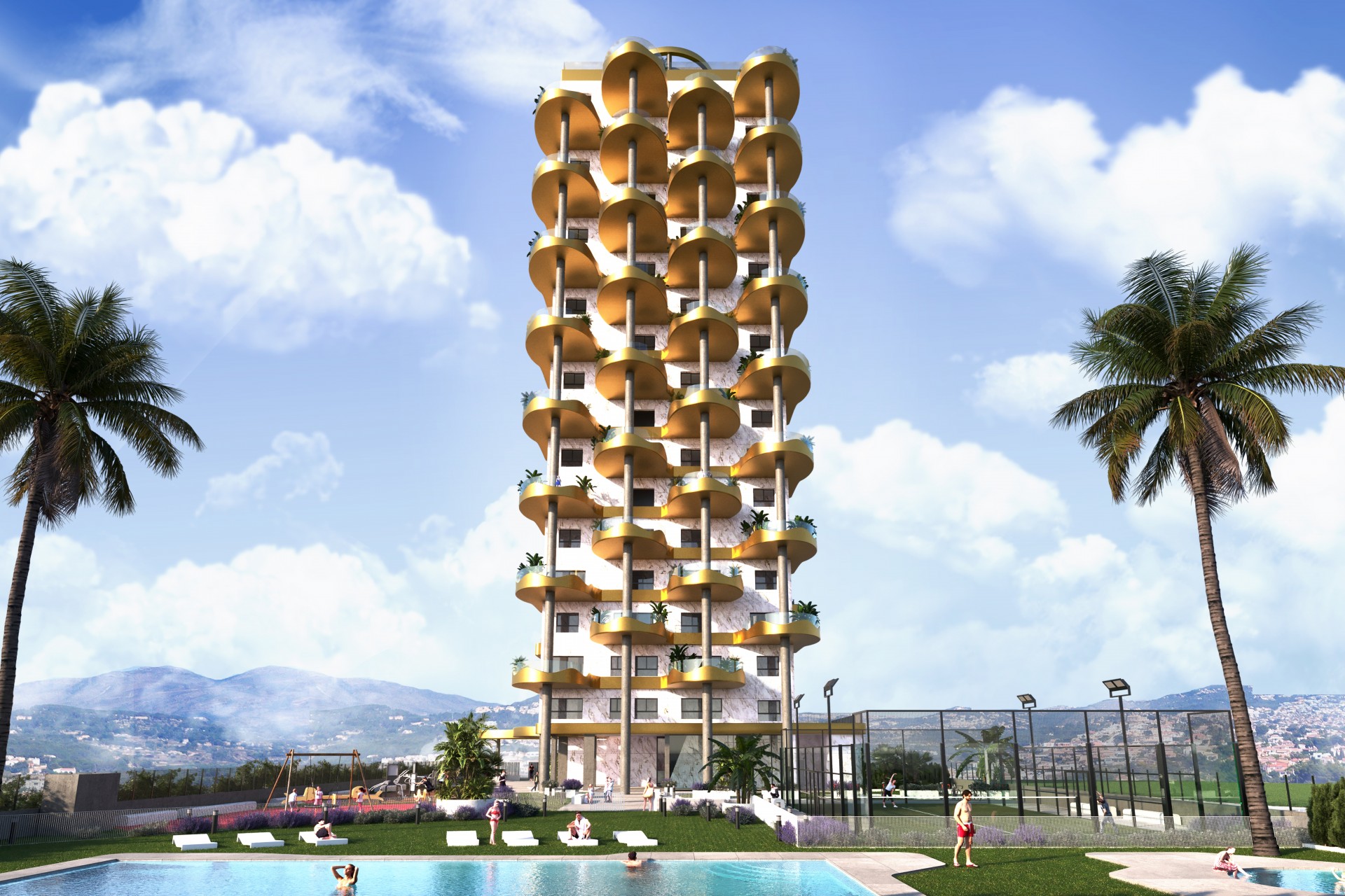 Położone na działce od cichej laguny, domy te dysponują basenem, kortami do paddle tenisa, siłownią, strefą do ćwiczeń gimnastycznych i miejscami zabaw dla dzieci w dużych obszarach wspólnych. Wyjątkową estetykę projektu podkreśla centralna oś, pień pokryty ceramiką o białych i złotych teksturach, tworząc uderzający kontrast z przeszklonymi tarasami, które wyłaniają się jak liście w świetlistym i odważnym złotym odcieniu. Witamy w Twoim nowym domu w Calpe, gdzie wyrafinowanie spotyka się z jasnością!