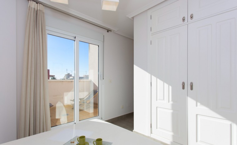 Mediterranean style bungalows only 150 metres from the beach in Santa Pola, Costa Blanca Alicante. The bungalows have 3 bedrooms, 2 or 3 bathrooms, a partially equipped kitchen and solarium. There are various models available.On the ground floor is the living-dining room with a large window and front terrace.The kitchen is fitted and equipped with ceramic hob and extractor hood.On the first floor you will find 2 or 3 bedrooms and a bathroom with a bathtub, a terrace and another staircase leading to the first floor.On the second floor you will find the third bedroom with another bathroom and a small solarium depending on the model. The properties have manual blinds, pre-installation for ducted air conditioning and private underground garage with sectional door, depending on the model. This residential complex is located a short distance from the port of Santa Pola and all the necessary services. This exclusive complex has a large communal green area and swimming pool.Santa Pola is a great location for a beach holiday, it has everything you need for a great family holiday. From the port of Santa Pola you can take an hourly ferry to the famous island of Tabarca.The main attraction of Santa Pola is obviously its beaches, which stretch for over 11 kilometres and are of the highest quality with numerous facilities. The nearest golf course is in the town of Ciudad Quesada, which has its own golf course: La Marquesa Golf and Country Club. Not convinced? TRY BEFORE YOU BUY! You can stay in this residence for a few nights for a small fee. This way you can get to know the residence and its surroundings personally! Contact us for more information.